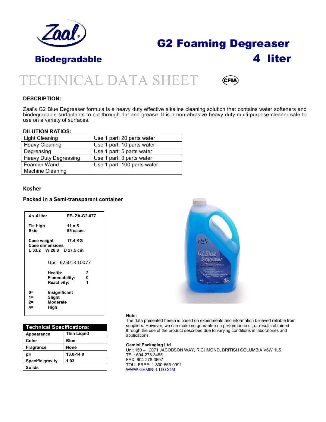 Tackle the greasiest jobs with Zaal’s G2 Foaming Degreaser – a heavy-duty alkaline cleaner that slices through baked-on oils and grime while remaining non-abrasive and safe on a variety of surfaces. Biodegradable surfactants and built-in water softeners deliver powerful, eco-conscious cleaning you can trust in kitchens, workshops, machinery and more. Packed in a handy 4 L semi-transparent jug, the highly concentrated formula lets you choose the perfect strength – from light cleaning (1:20) to intense degreasing (1:3) – for professional results and unbeatable value in every pour.