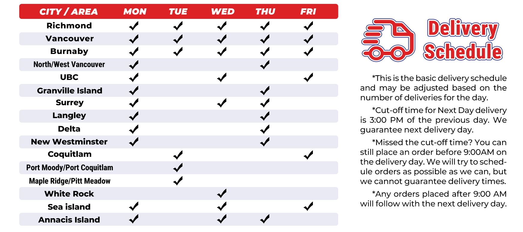 - Dedicated Routes for Outlying Areas: Our logistics team has established reliable delivery routes to key areas such as Surrey, Langley, and Delta, with specific service days to optimize efficiency and coverage.