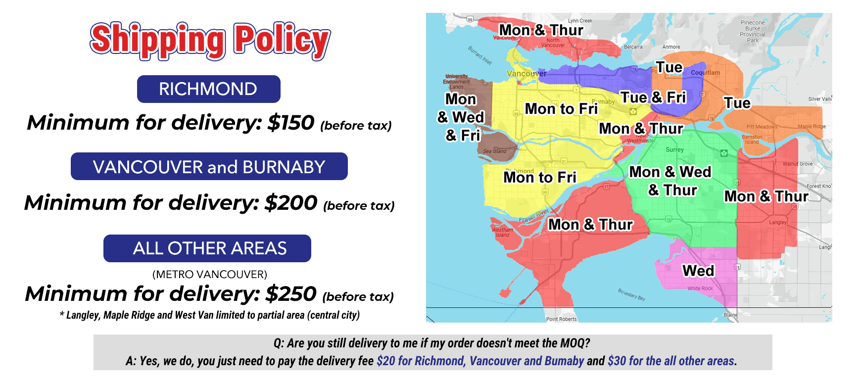 A. Yes, we do. You just need to pay the delivery fee, which is $20 for Richmond, Vancouver, and Burnaby and $30 for all other areas.